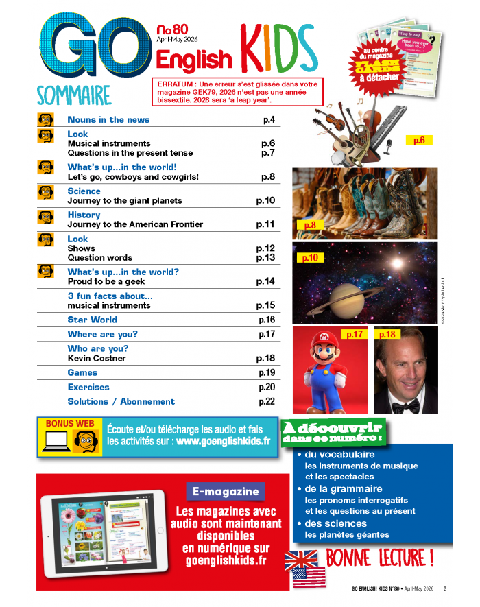 GO ENGLISH KIDS est l’outil parfait pour faire aimer l'anglais à vos enfants : les articles culturels anglophones adaptés à leur âge vont les passionner (cinéma, société, voyage, science, histoire/géographie…).